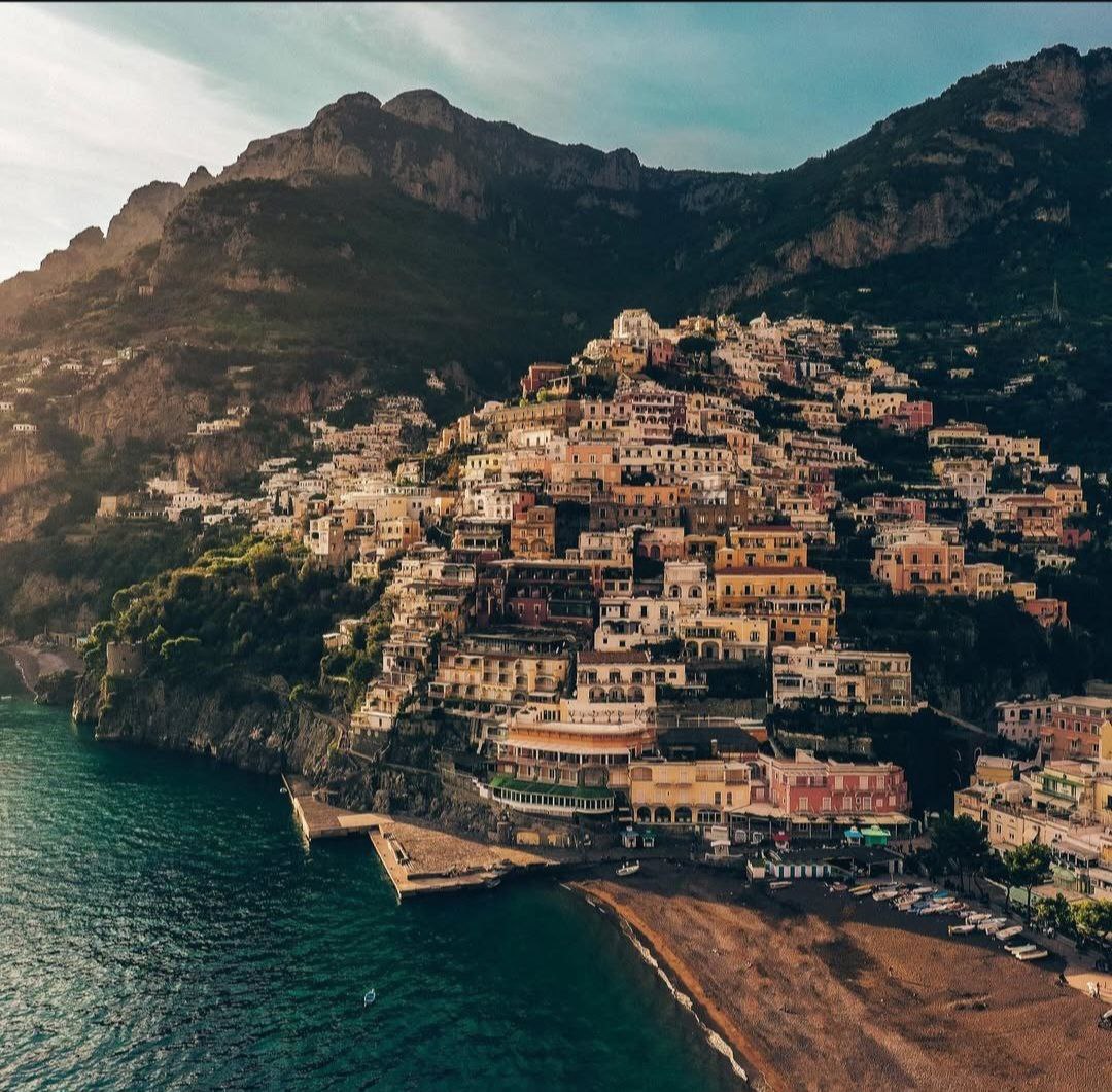 Positano is a picturesque village, nestled in the mountains and surrounded by rich Mediterranean vegetation. Seen from the sea it appears like a cascade of colorful houses leaning against each other. Between the houses, some narrow streets descend steeply to the Marina Grande beach.